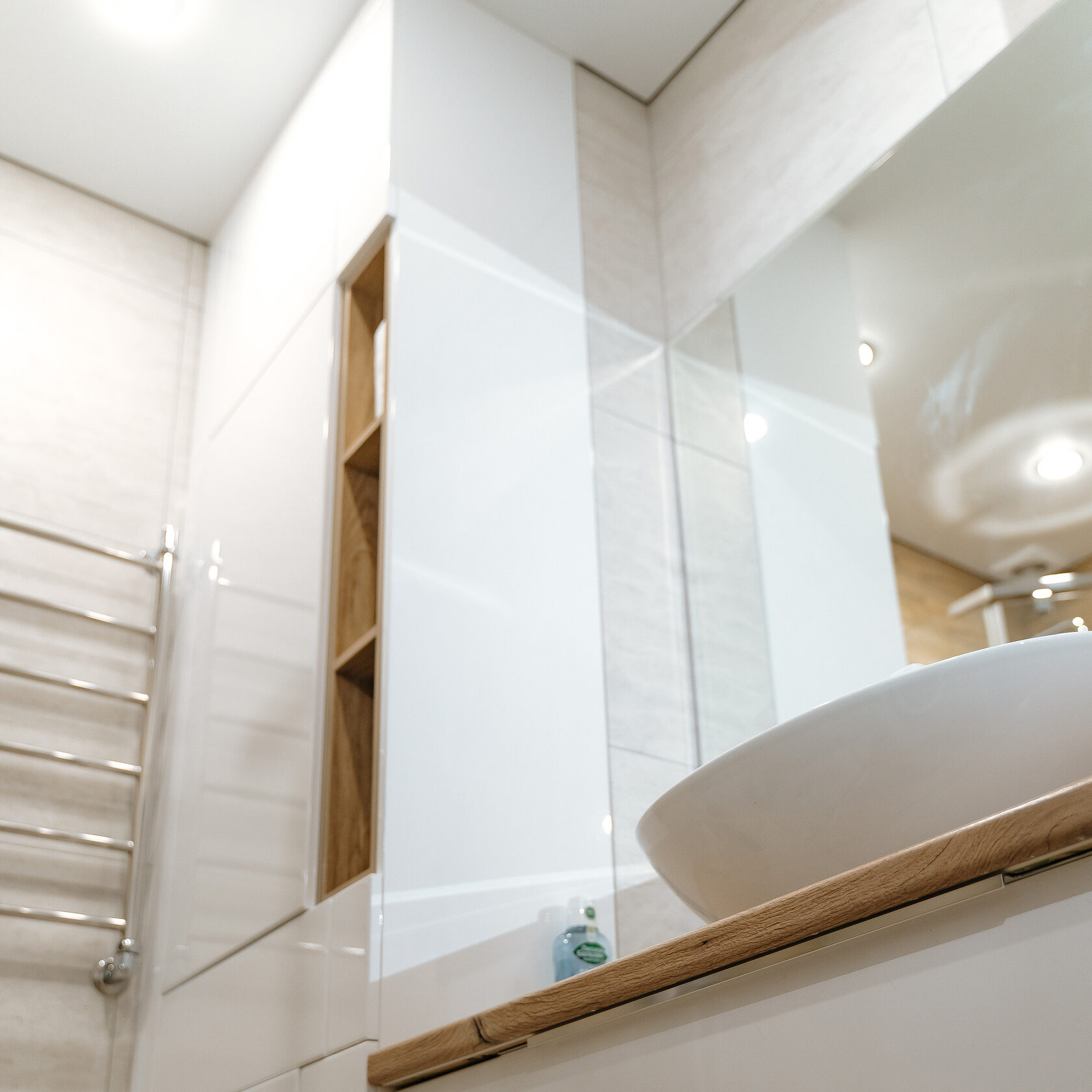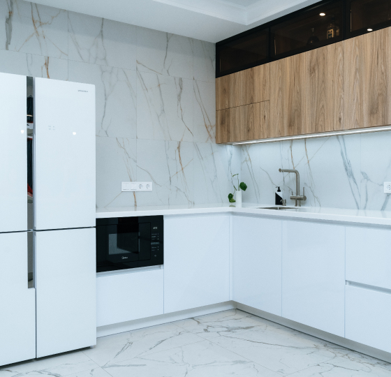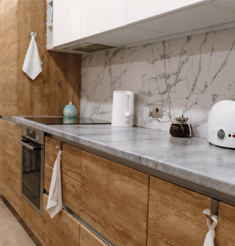 Минимизировать воздействия воды и горячего пара. Глянцевые поверхности можно привести в порядок с помощью средства для стекол. Никаких образивных и агрессивных веществ. Часто фасады можно обработать мыльным раствором с любым моющим средством для посуды.