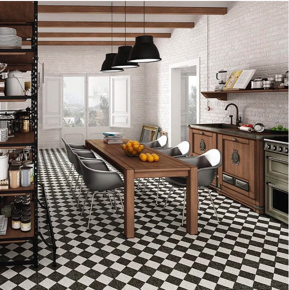 Этот рисунок напоминает шахматную доску и предполагает сочетание черной и белой керамики квадратной формы.