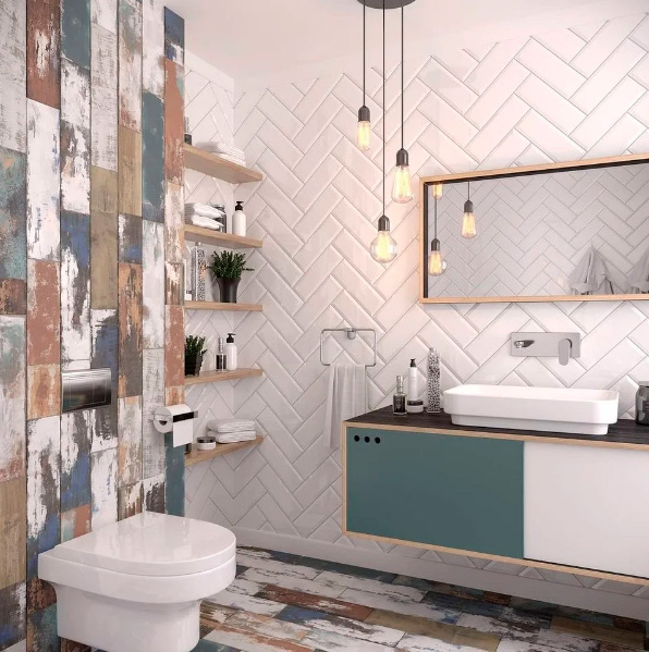 Чтобы интерьер не выглядел скучным, можно использовать цветную керамическую облицовку или сочетать ее с краской и обоями. Также можно использовать цветную затирку и играть с размером плитки.