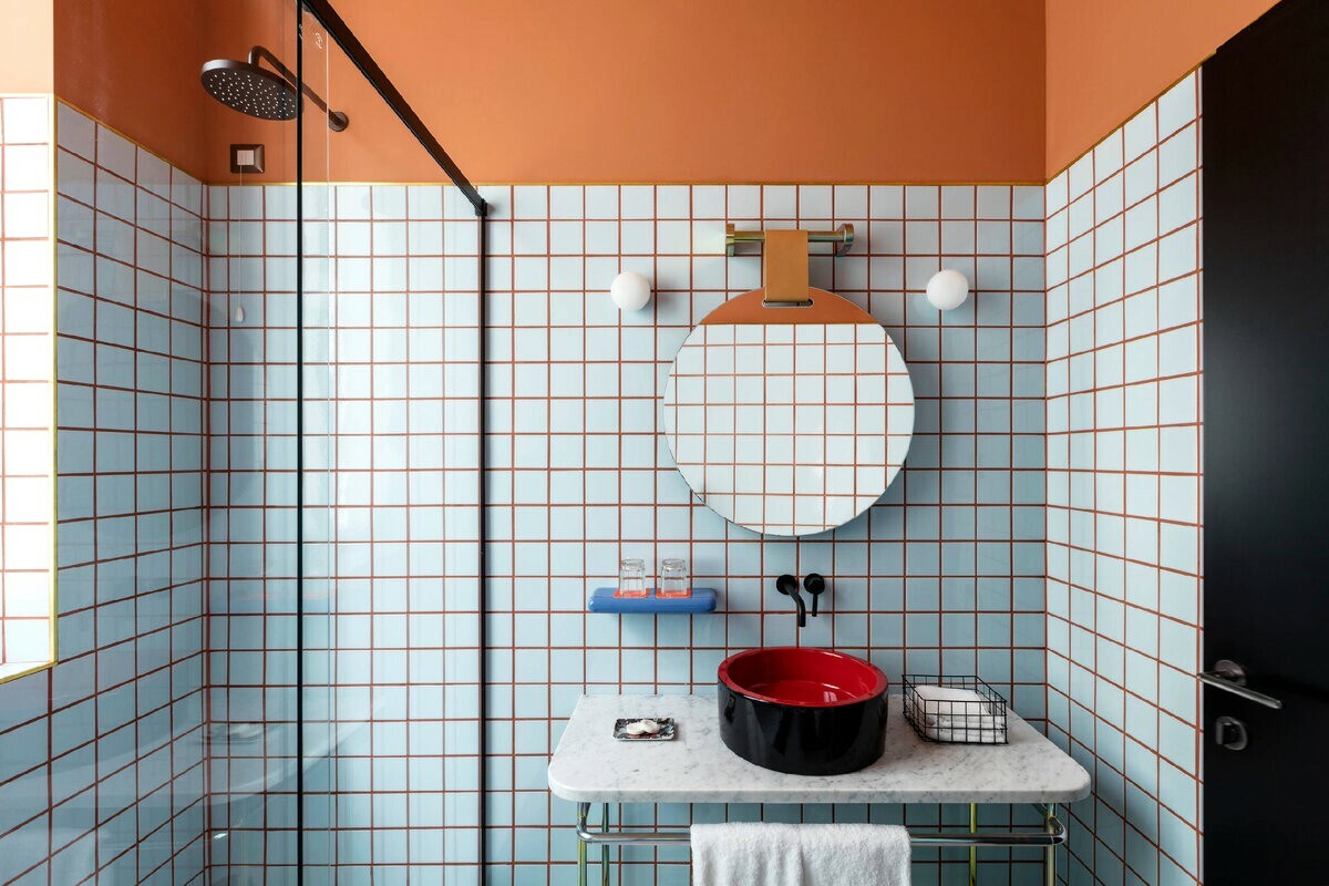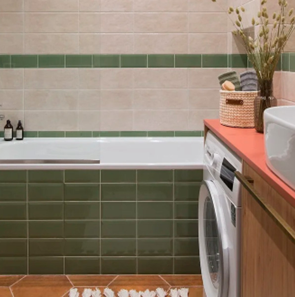 Количество этих линий может быть любым, но с цветами лучше не экспериментировать: выбрать контрастный оттенок к базовой керамике и продублировать его еще где-то: в напольной отделке, декоре.